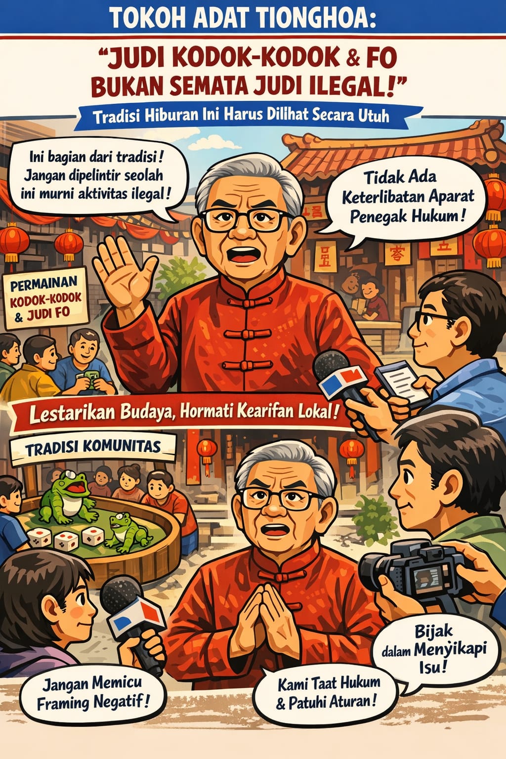 “Ini bukan semata-mata soal judi dalam pengertian sempit. ‘Kodok-kodok’ dan ‘fo’ sudah ada sejak lama dan tumbuh sebagai bagian dari hiburan rakyat pada momen tertentu. Jangan dipelintir seolah ini murni aktivitas ilegal tanpa melihat konteks budaya,” ujarnya kepada wartawan, Sabtu (4/4/2026).