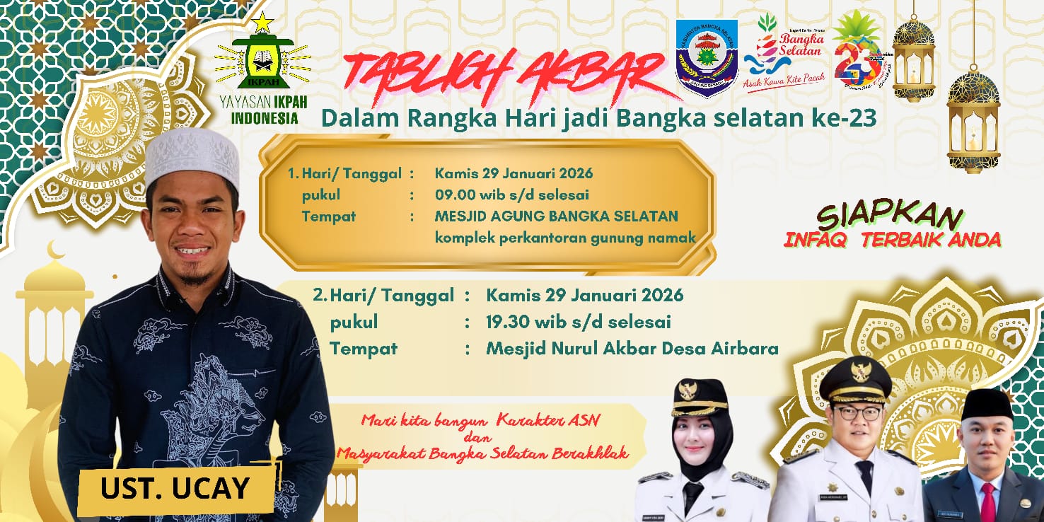 “Mewakili pimpinan, saya mengucapkan terima kasih kepada Yayasan IKPAH Indonesia yang telah menghadirkan Ustaz Ucay, untuk mengisi ceramah di Bangka Selatan bertepatan dengan peringatan Hari Jadi ke-23 Kabupaten Bangka Selatan,” ujarnya.